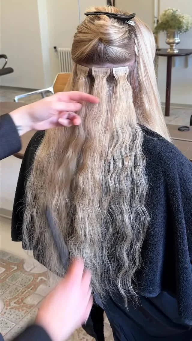 Tape-in Extensions sind dünne Echthaarsträhnen, die am Eigenhaar befestigt werden.