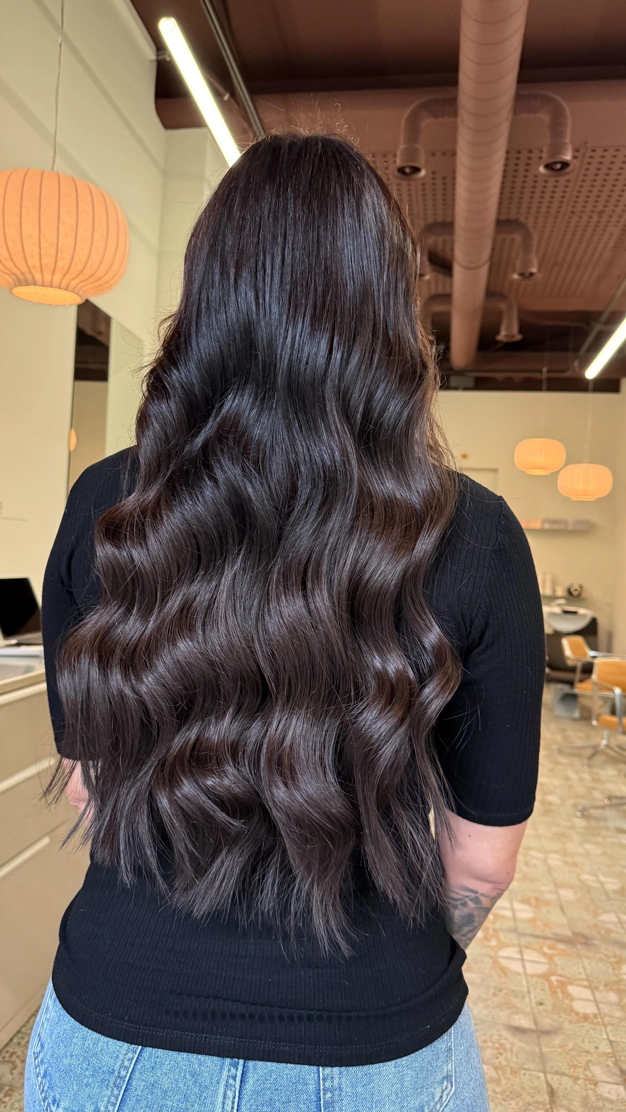 Für diesen Look haben wir 100 Gramm hochwertige Haartressen mit einer Länge von 45 Zentimetern eingearbeitet. Das Ergebnis: deutlich mehr Fülle und eine sichtbare Verlängerung, die den Haaren neues Volumen verleiht.
